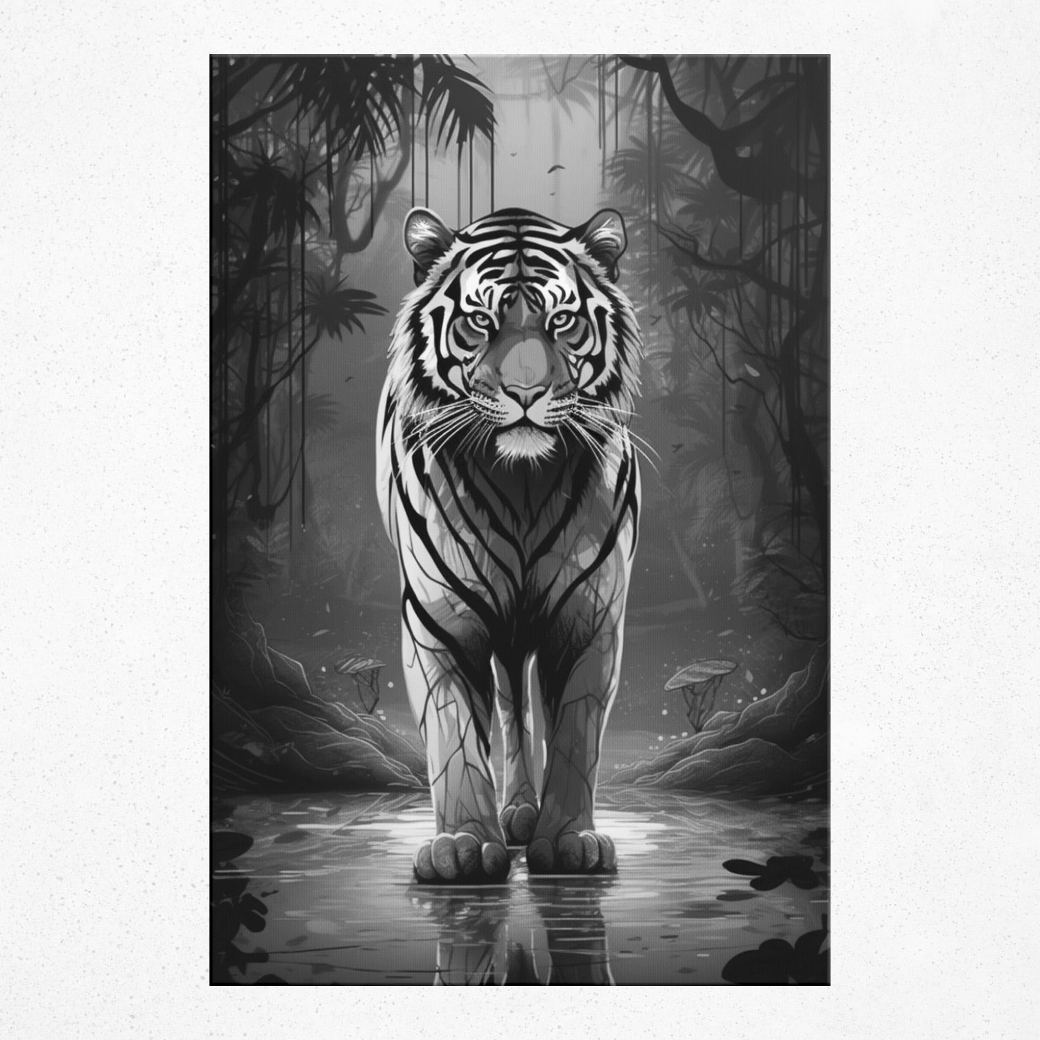 • Delve into the mystic realm of Rivera Realms with "Eclipsed Majesty." The tiger, fierce and vivid, stands as a stark contrast to its shadowy forest backdrop, serving as a beacon of wild power amidst the surreal gloom. This digital art captures nature's raw intensity, echoing the juxtaposition of life's vibrant moments against its darker passages. Invite a touch of the wild into your space and let this piece ignite conversations of strength, contrast, and the beauty of existence.