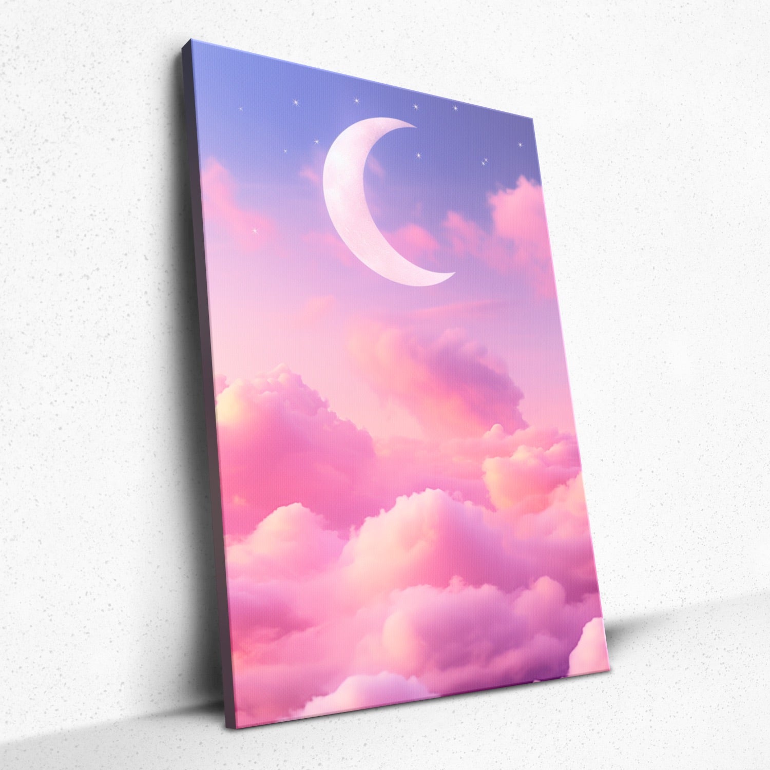 • Dive into the serene embrace of "Lunar Blush" by Rivera Realms. Gentle pink clouds cradle a delicate crescent moon, creating an ethereal dreamscape that invites tranquility and wonder. This piece isn't merely art; it's a whispered lullaby for the soul. Let it grace your space, offering a daily dose of calm and celestial beauty with every glance.