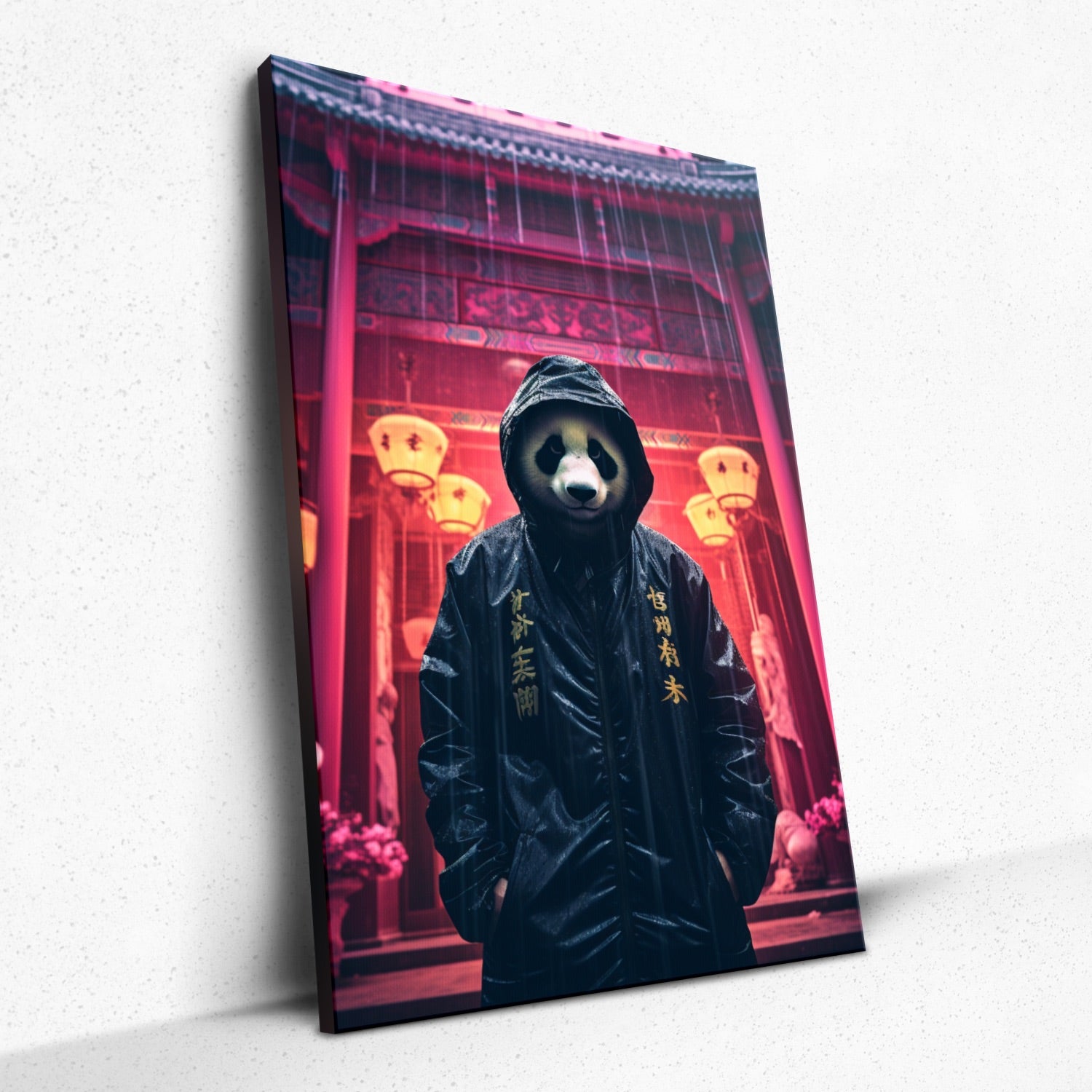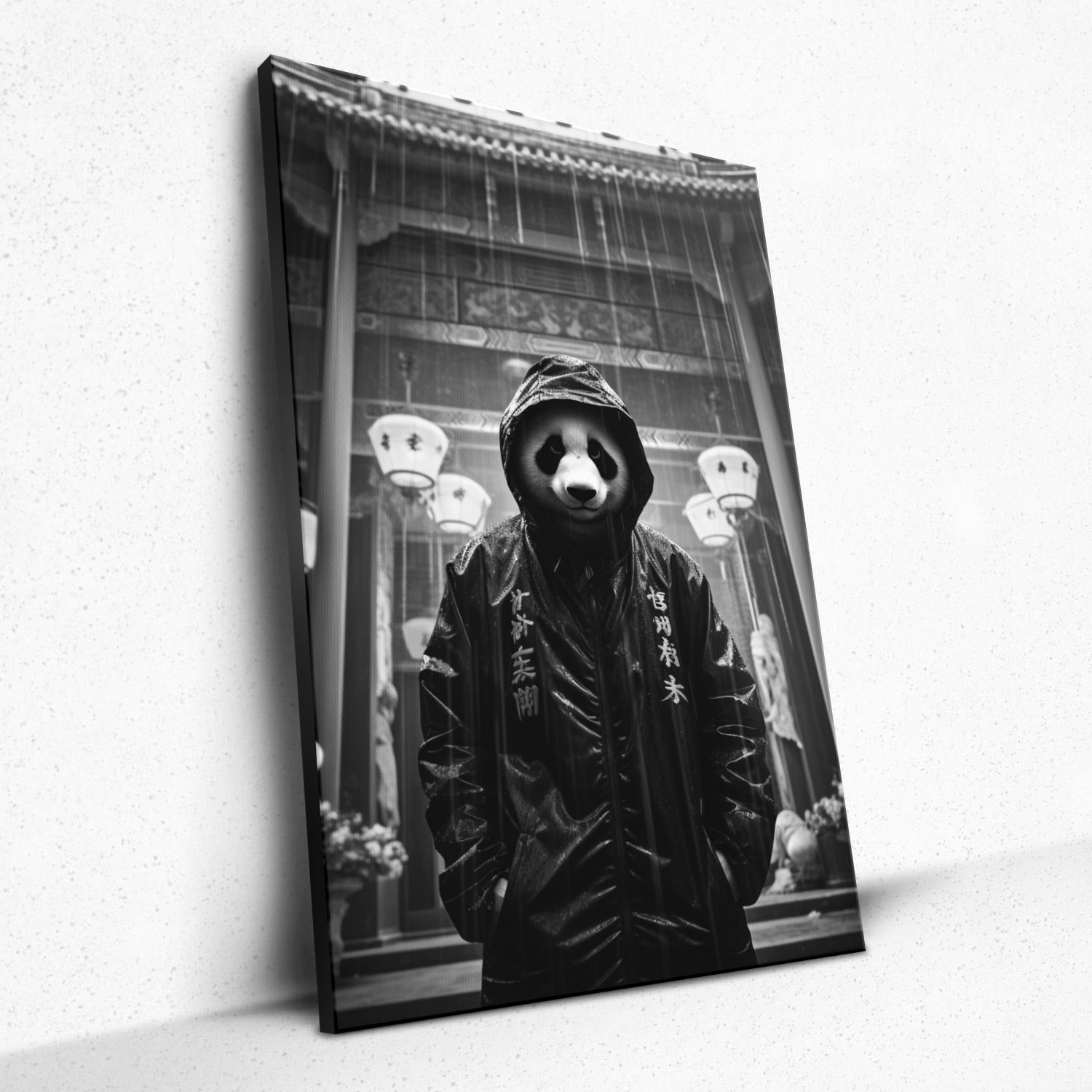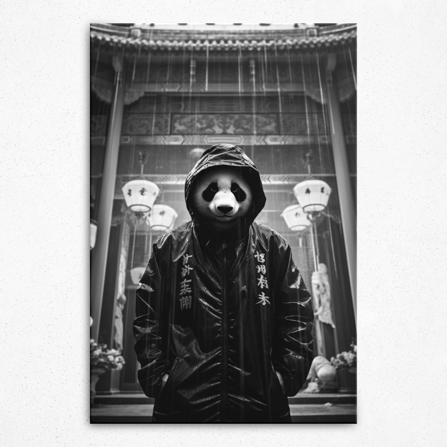 • Experience the whimsical charm of "Monsoon Monarch" from Rivera Realms. As rain graces ancient Chinese architectures, a panda, robed in a raincoat, stands as the embodiment of serene audacity amidst the drizzle. This piece, both playful and profound, fuses cultural reverence with the unexpected. It's not just art; it's a delightful tale of tradition meeting quirky charm, promising to be that conversation starter every room yearns for. Let this panda's poised stance inspire resilience and grace in any setting.