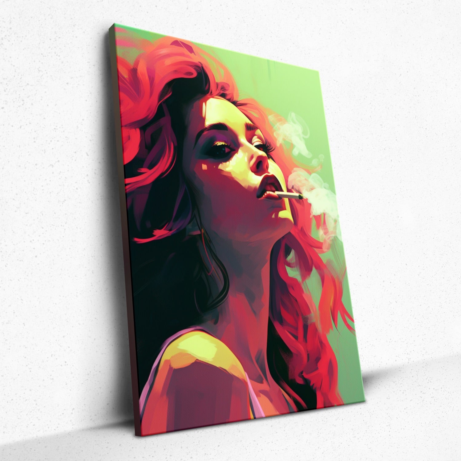 • Introducing 'Auburn Allure', a Rivera Realms masterpiece that captures fleeting moments in bold strokes. The red-haired muse, rebelliously poised with a cigarette, contrasts the vibrant lime green canvas, emanating an aura of audacity and grace. This ephemeral painting is more than mere color and form; it's a manifestation of defiance, freedom, and mystique. Envelop your space with this tantalizing allure that's bound to captivate any onlooker.
