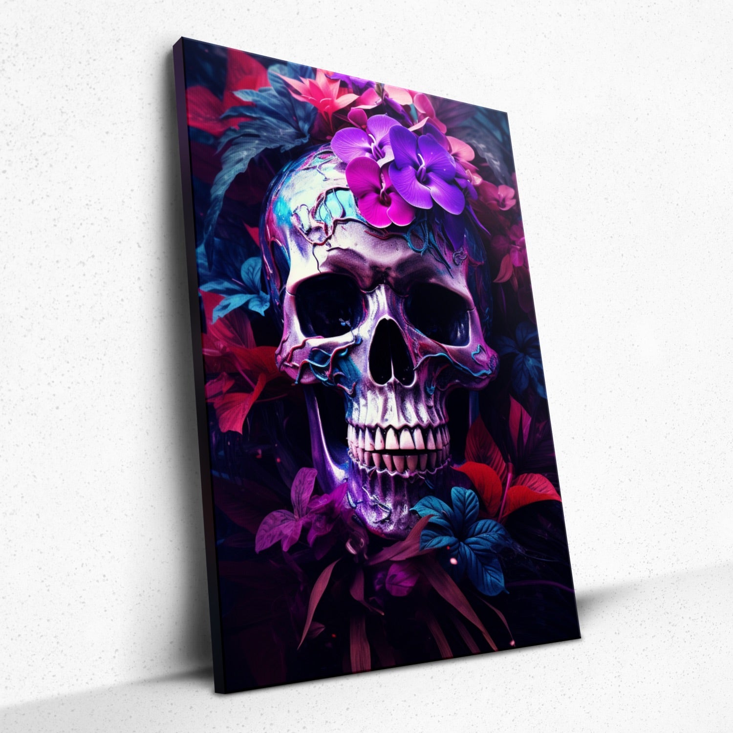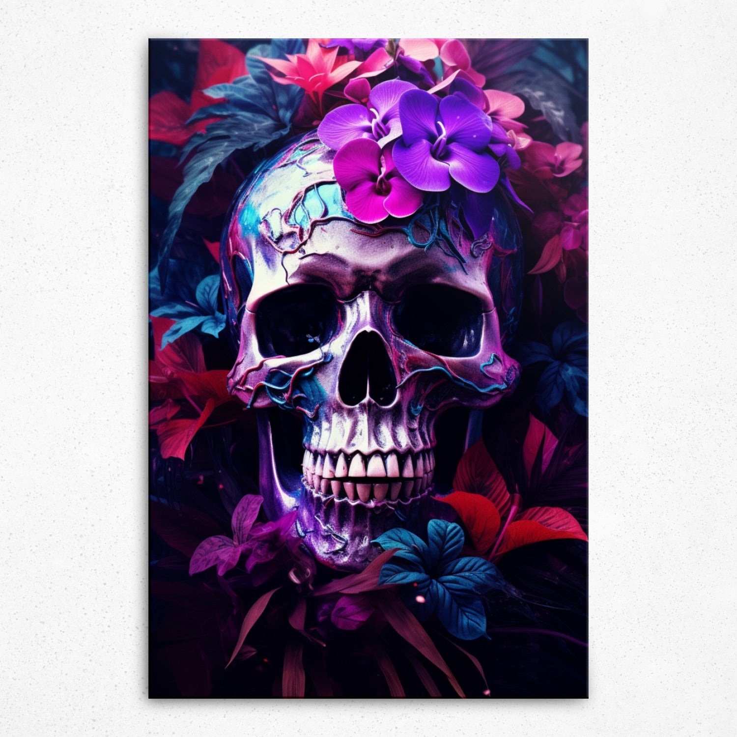 • Dive deep into the "Blossomed Eternity" by Rivera Realms, where the starkness of mortality melds seamlessly with the fervor of nature's bloom. This piece showcases a skull, a symbol of life's transient nature, cocooned by the fervent embrace of violet and red blossoms. It's a poignant reminder of rebirth, beauty in decay, and the immortal dance between life and death. Let it be the conversation starter, inviting viewers to ponder existence and the vibrant afterlife of nature.