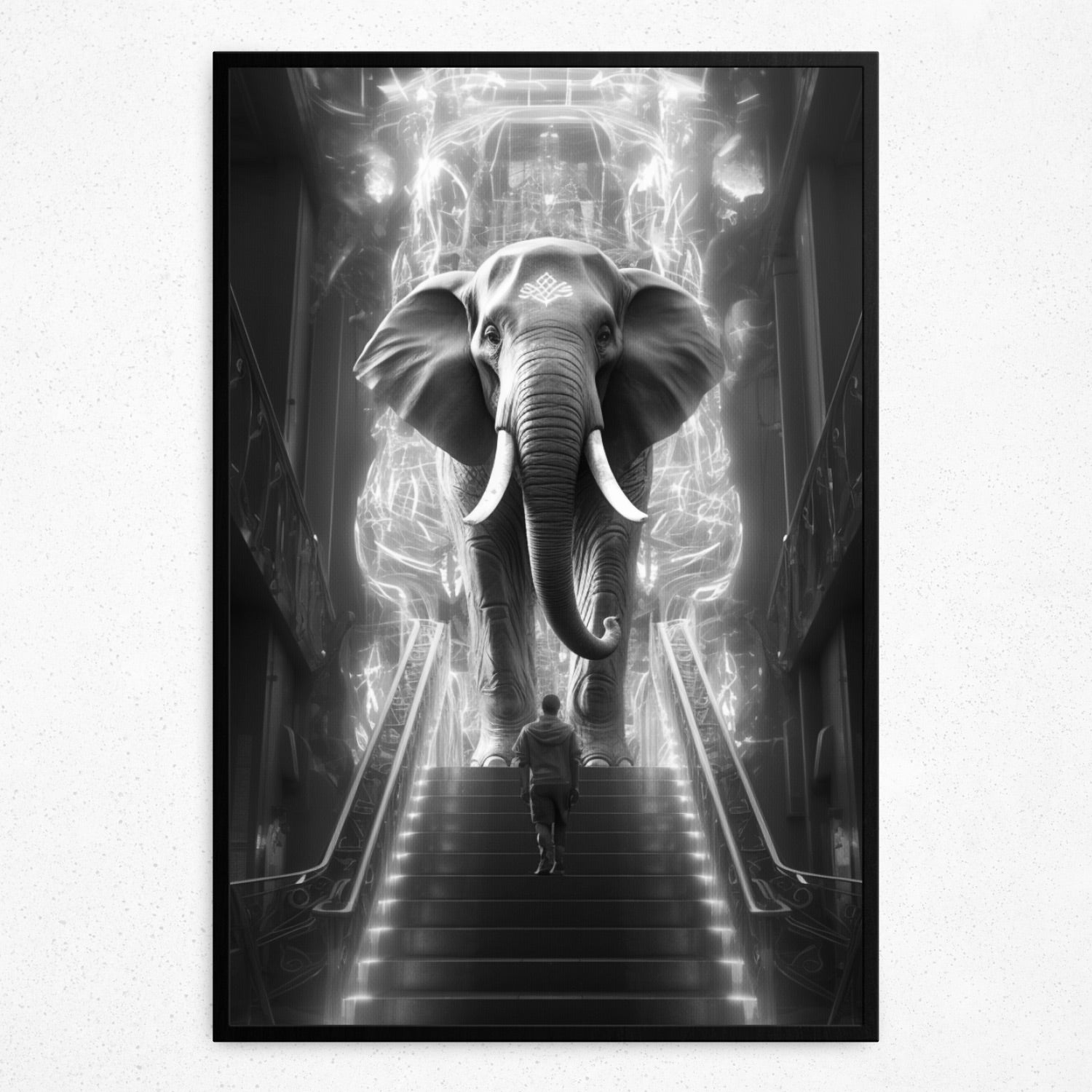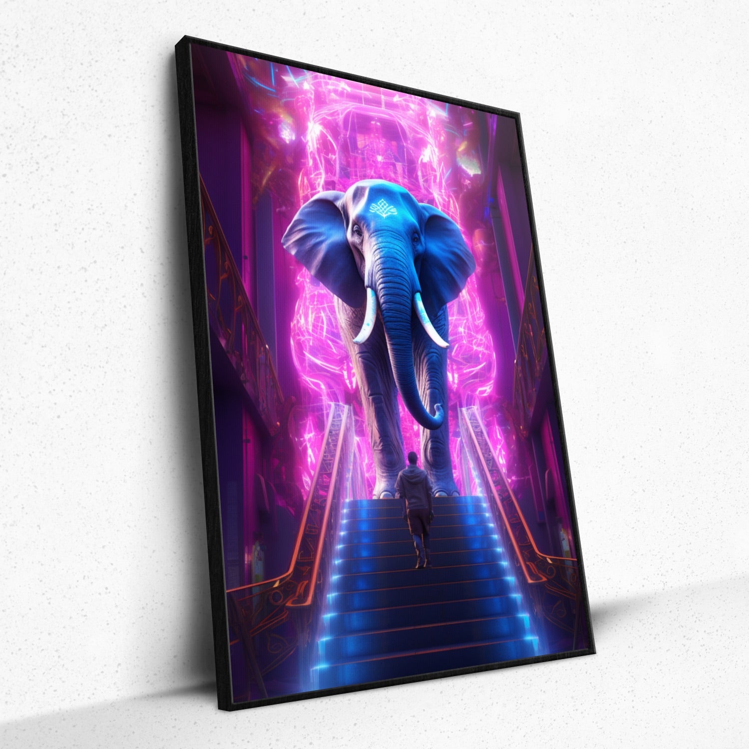 • Dive into the ethereal realms of Rivera Realms with "Celestial Encounter." This piece captures a surreal rendezvous between man and a resplendent blue elephant, set against an enchanting cascade of pink luminosity. As the lone man ascends, the anticipation becomes palpable, drawing viewers into a tale of reverence, mystery, and the boundless wonders of the universe. This radiant composition promises to be an extraordinary conversation starter, exuding awe and majesty with every glance.