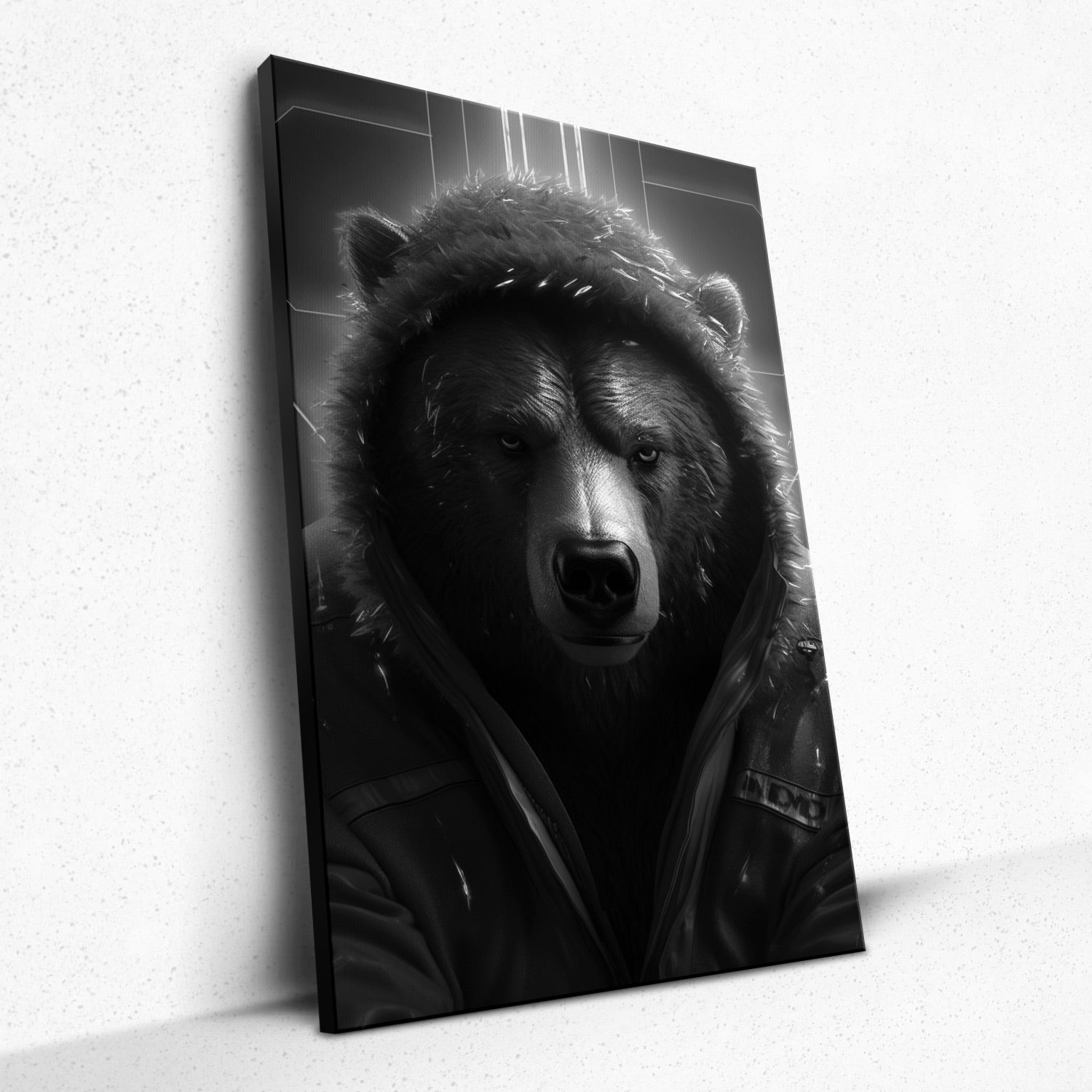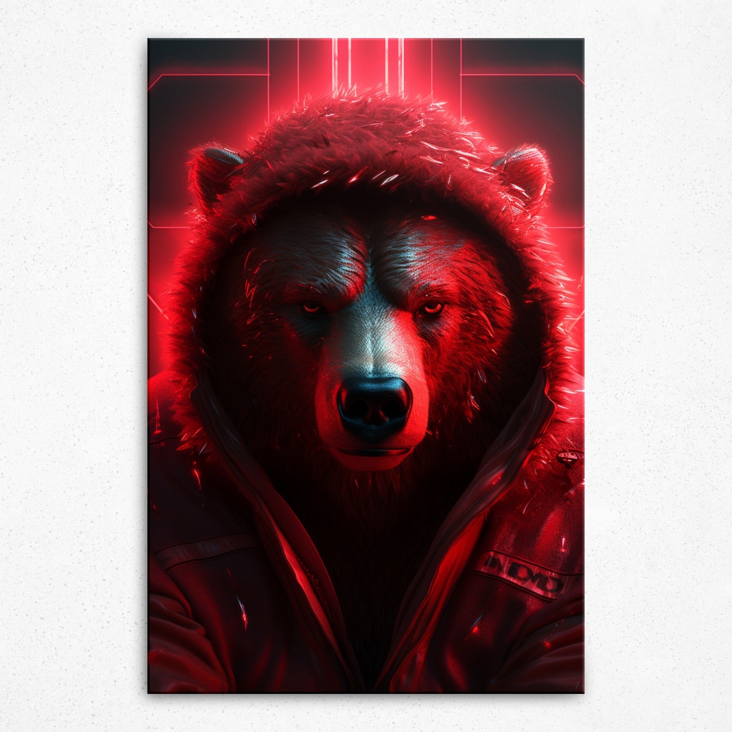 • Dive into the depths of "Crimson Cloak" from Rivera Realms, where fury meets fashion in a juxtaposition of raw power and contemporary style. An imposing black bear, animated with palpable rage, dons a winter hoodie, both a symbol of modernity and a protector against nature's chill. The fiery red hue that illuminates this majestic beast captures a spirit untamed, yet touched by the hand of human influence. An audacious statement for any space, this piece brings the wild heart of nature right into your room, demanding attention and reverence.