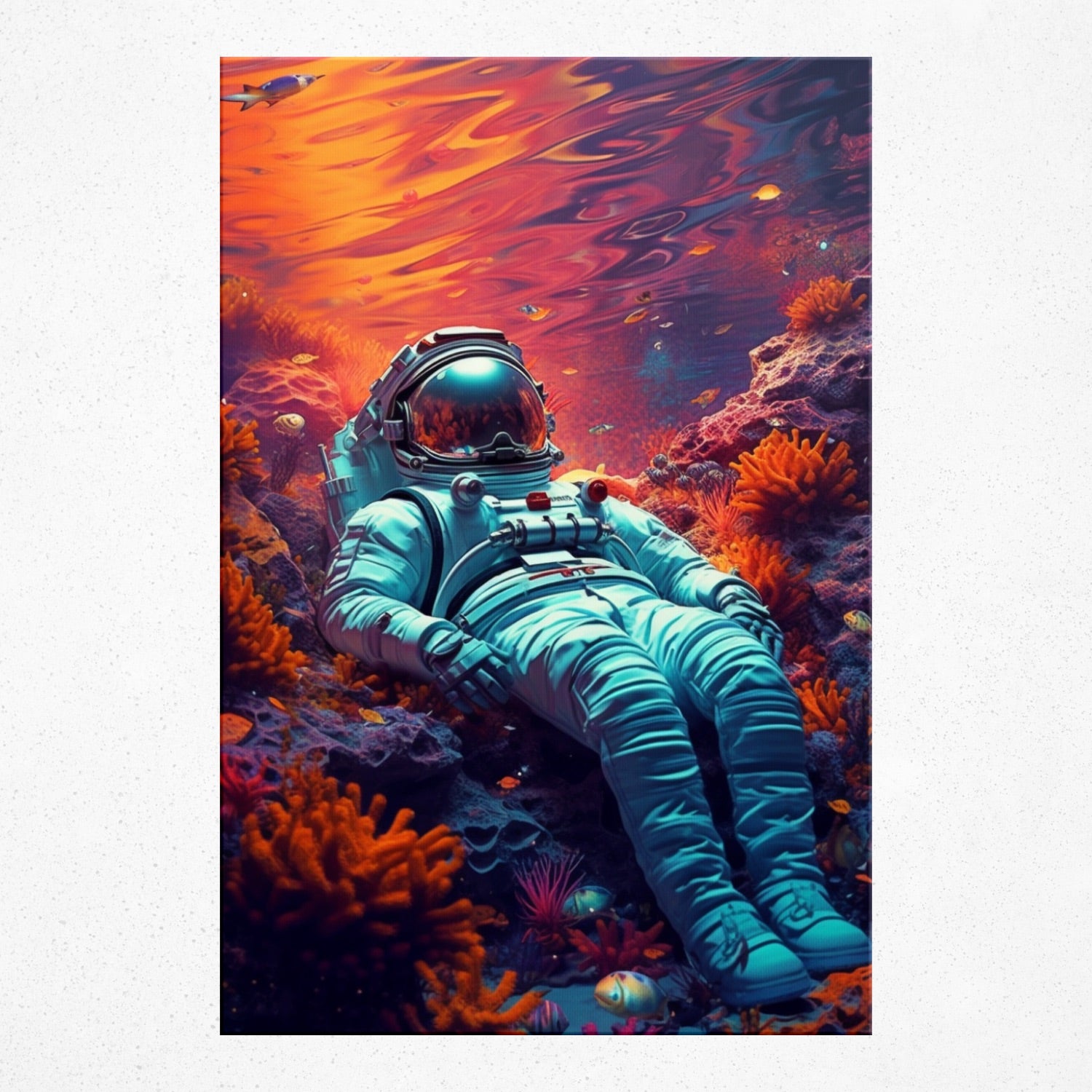 • Unveiling the 'Crimson Cosmos Depths', a realm where the vastness of space melds with the enchanting undercurrents of the ocean. An astronaut, adrift among ruby-hued corals and fish, redefines boundaries and expectations. With Rivera Realms' touch, feel the weight of the universe in the silence of the deep, where wonder meets melancholy. This piece doesn't just hang; it immerses, transporting you to a world of fiery serenity and infinite marvel.