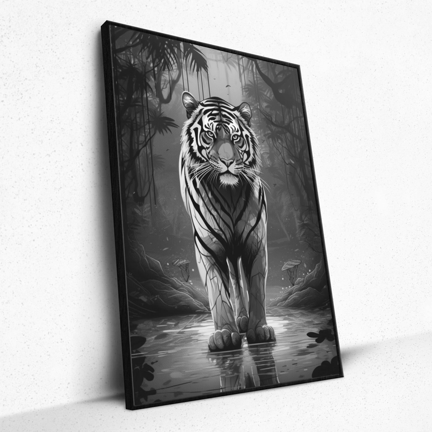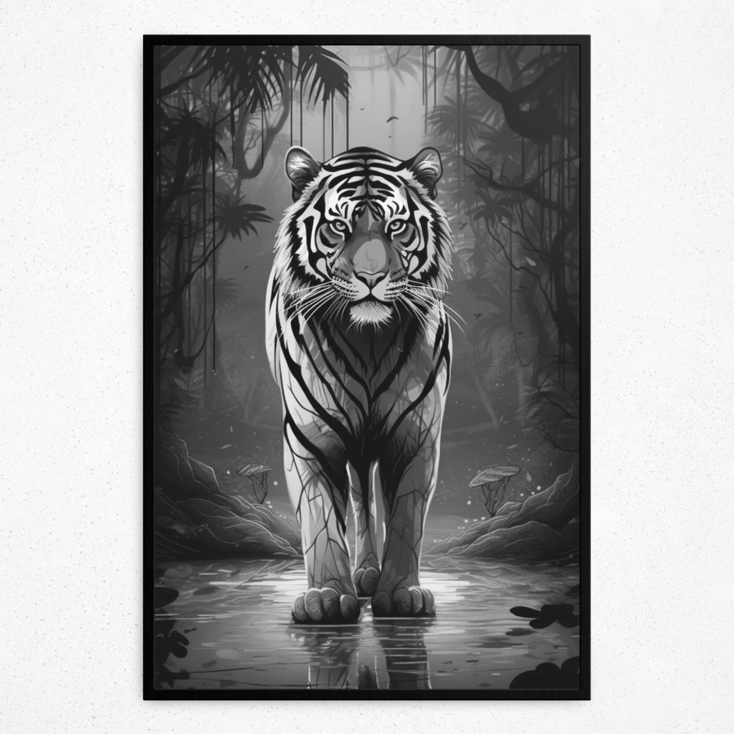• Delve into the mystic realm of Rivera Realms with "Eclipsed Majesty." The tiger, fierce and vivid, stands as a stark contrast to its shadowy forest backdrop, serving as a beacon of wild power amidst the surreal gloom. This digital art captures nature's raw intensity, echoing the juxtaposition of life's vibrant moments against its darker passages. Invite a touch of the wild into your space and let this piece ignite conversations of strength, contrast, and the beauty of existence.
