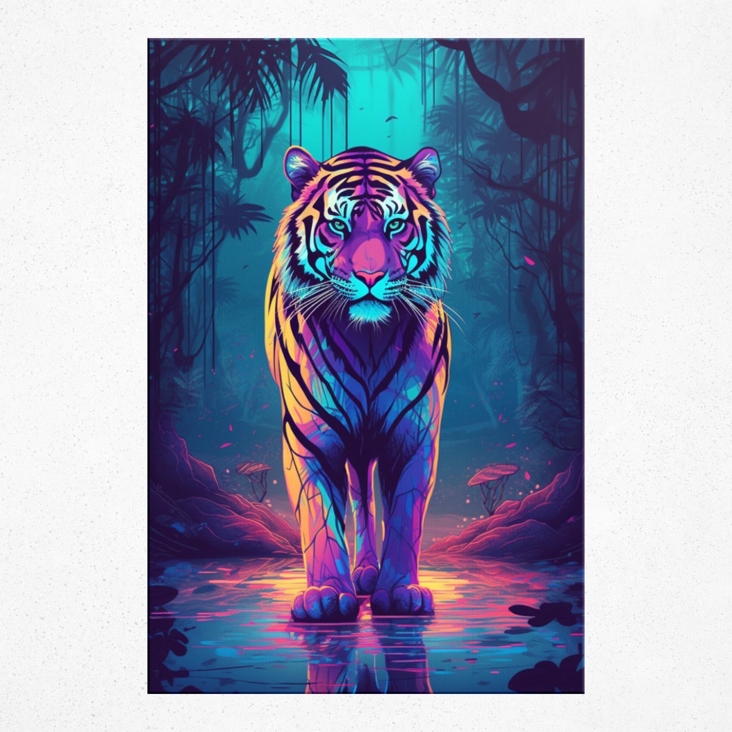 • Delve into the mystic realm of Rivera Realms with "Eclipsed Majesty." The tiger, fierce and vivid, stands as a stark contrast to its shadowy forest backdrop, serving as a beacon of wild power amidst the surreal gloom. This digital art captures nature's raw intensity, echoing the juxtaposition of life's vibrant moments against its darker passages. Invite a touch of the wild into your space and let this piece ignite conversations of strength, contrast, and the beauty of existence.
