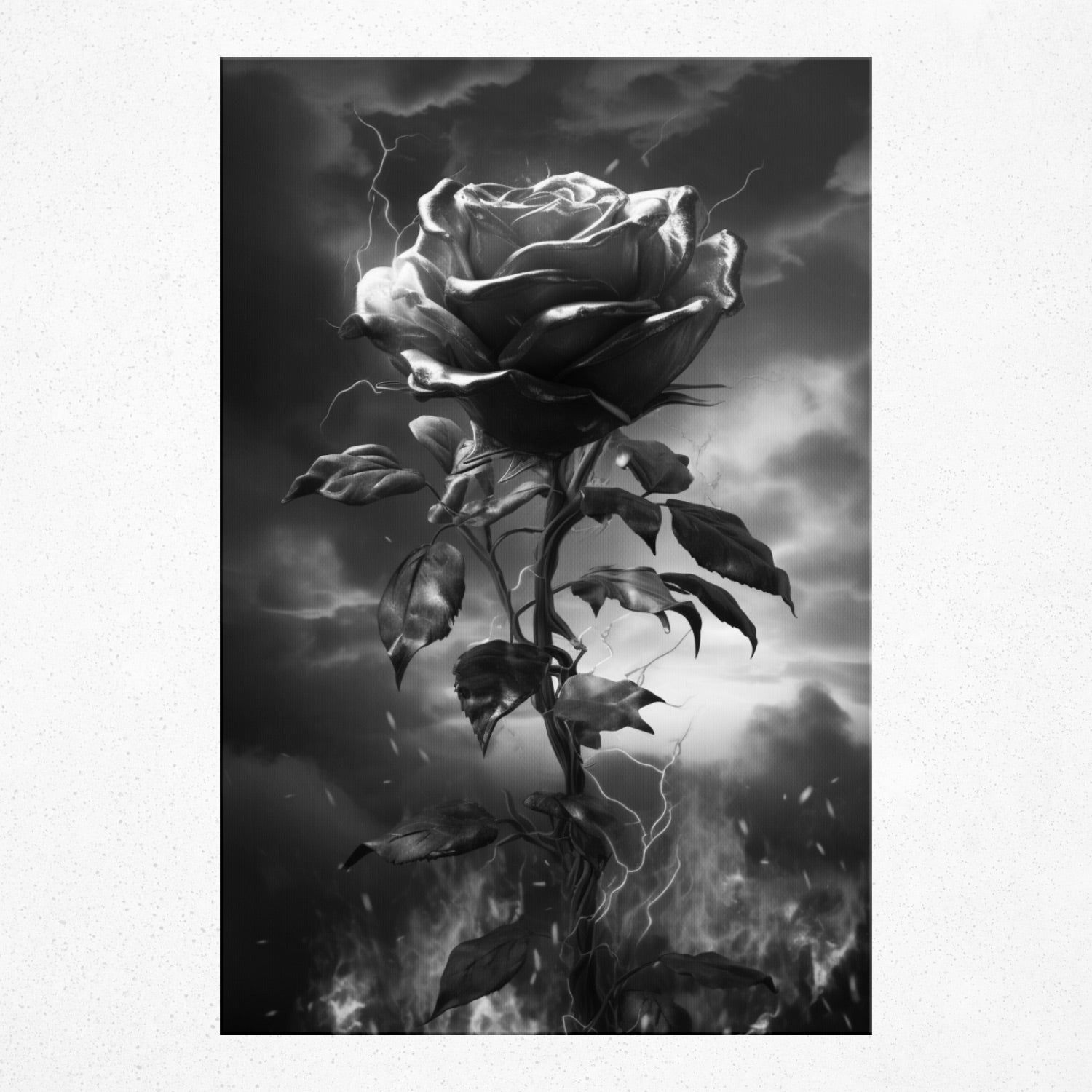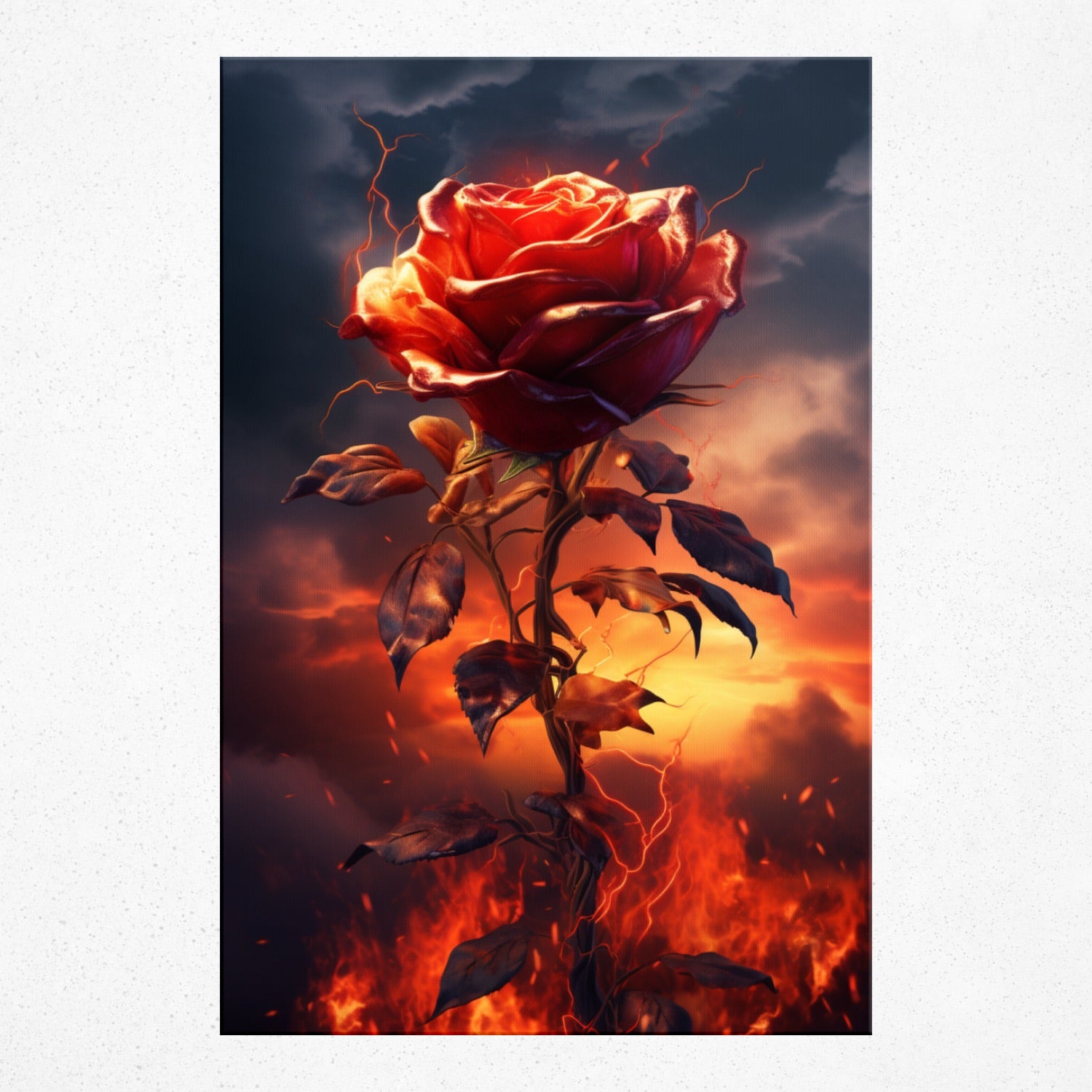 • From the heart of Rivera Realms, behold "Electrified Elegance", where nature and fury entwine. A solitary rose stands resilient, its petals draped in riveting red lightning, casting a mesmerizing dance of power and vulnerability. Amidst the blazing terrain, this work evokes the undying spirit of beauty even in the face of adversity. Let this piece spark conversations and illuminate your space with its intense emotion and undeniable charisma.