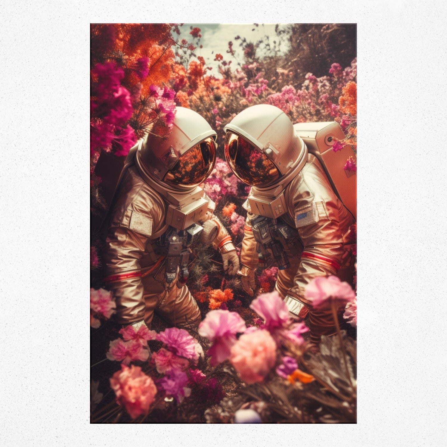 • Dive deep into the ethereal beauty of "Floral Nebula Nexus" by Rivera Realms. Two astronauts, seemingly out of their element, find harmony amidst a vibrant sea of flowers. This imaginative juxtaposition of the cosmic and the earthly speaks to the boundless connections that exist in our universe. A true conversation starter, let this unique art piece transport any space into a dreamlike dimension where wonder and nature converge. Embrace the unexpected, for in its heart lies magic.