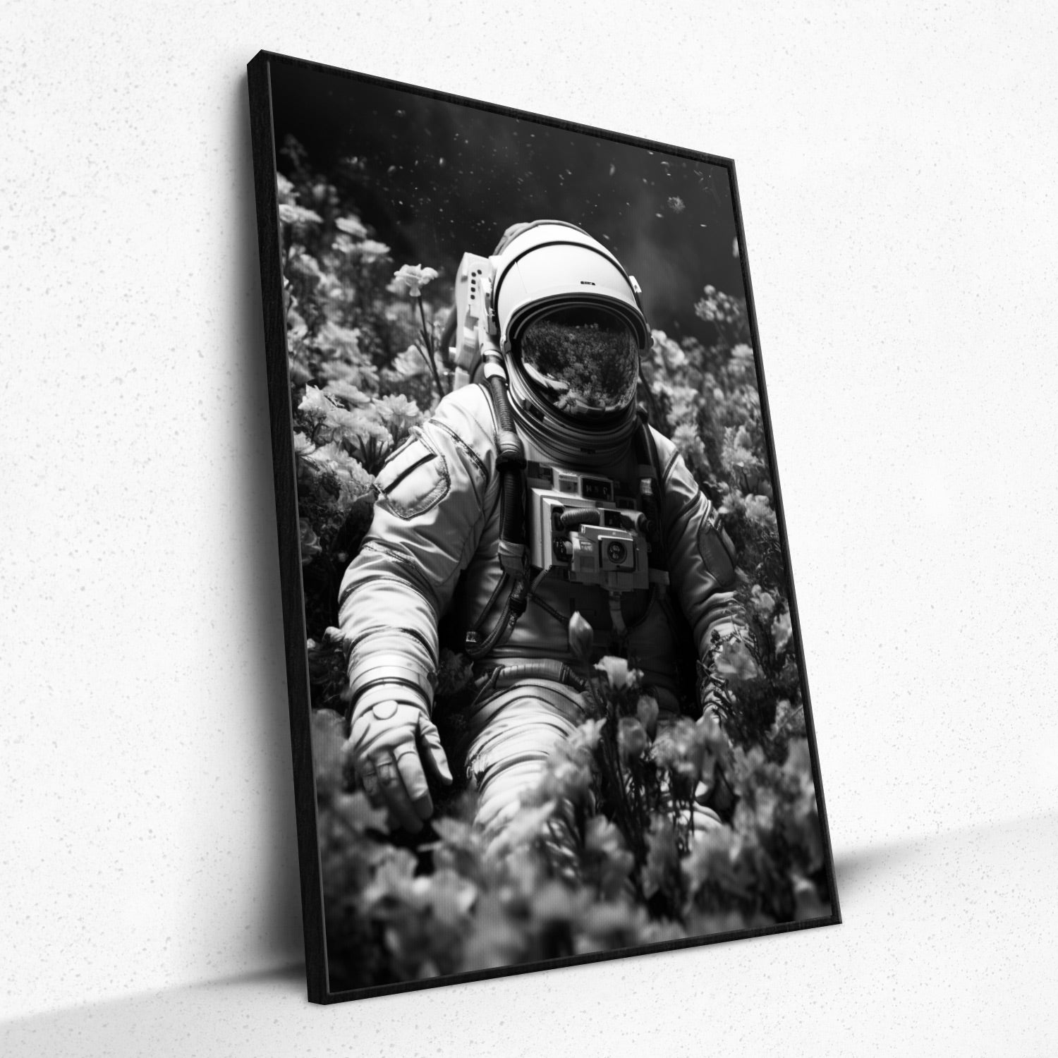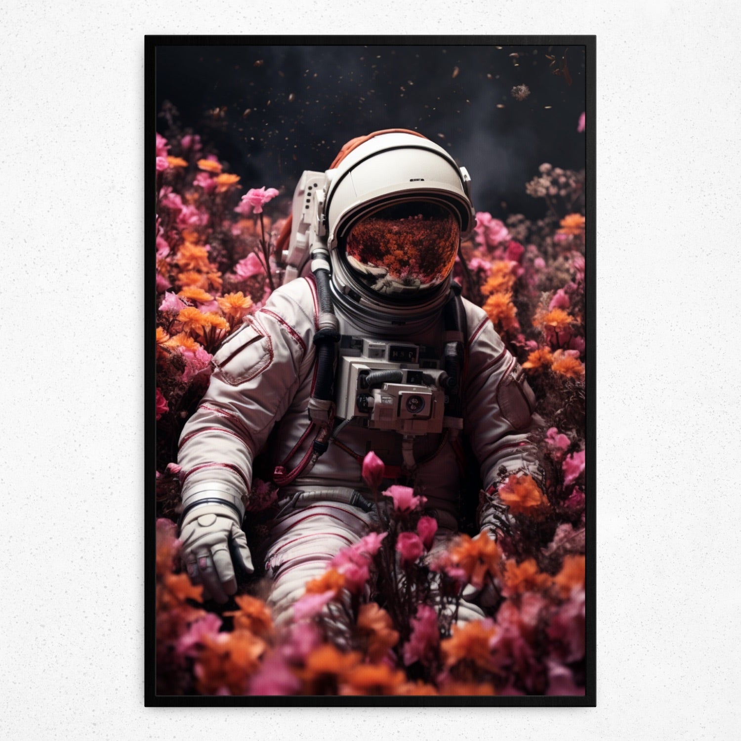 • Revel in 'Galactic Petal Solitude', where Rivera Realms paints a poignant intersection of cosmic vastness and earthly bloom. An astronaut, seated amid a sea of vibrant pink and orange petals, looks toward the distant, inky universe, capturing a heart-tugging blend of isolation and beauty. This piece speaks of silent introspection, of belonging amidst infinity, and of moments when the universe feels intimately close. In its embrace, one finds serenity, wonder, and an overwhelming sense of connection.