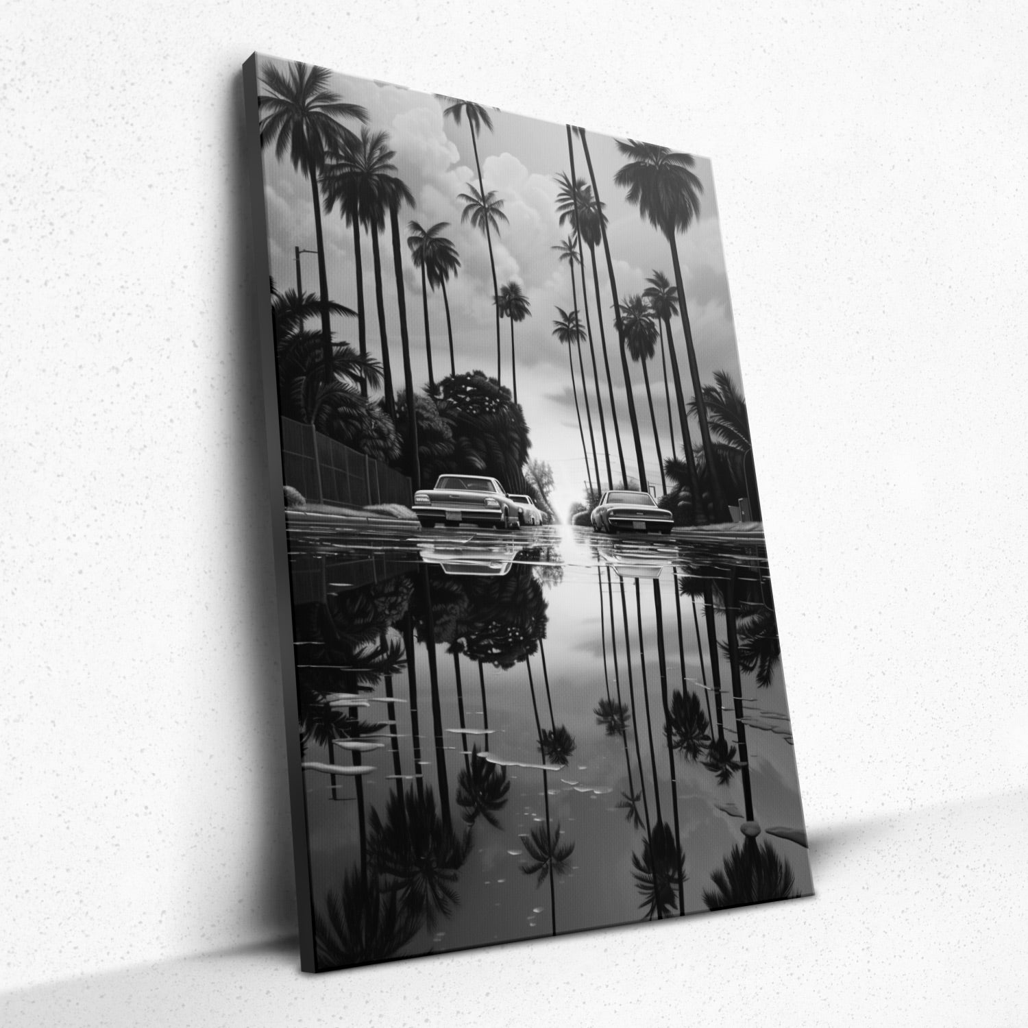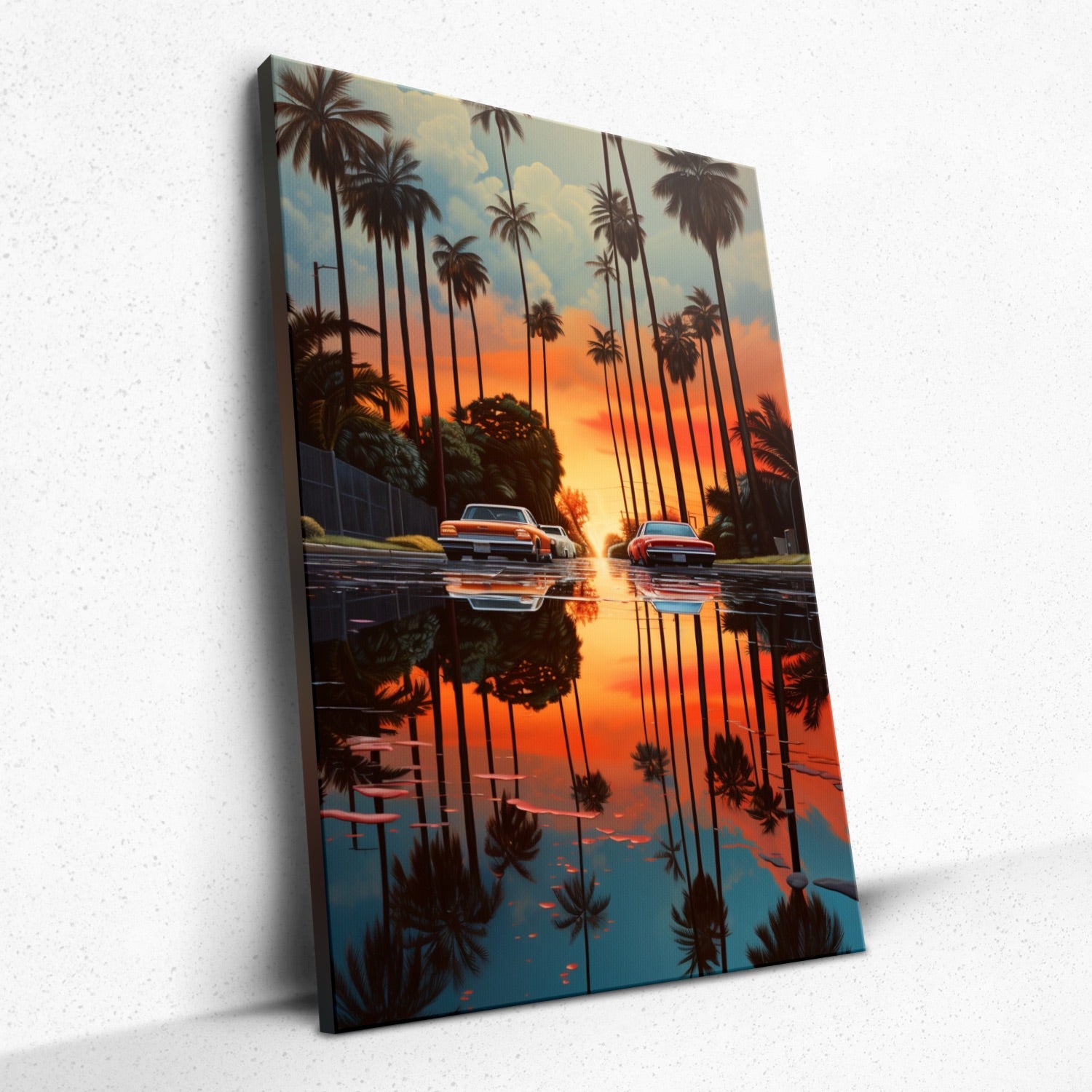 • "Horizon's Echo" by Rivera Realms encapsulates a serene moment where the natural world mirrors human movement. As the sun melts into the horizon, its radiant departure is mirrored in an untouched puddle, with the rhythmic dance of cars driving towards destiny. This piece evokes feelings of transition, reflection, and the intricate blend of nature with man-made wonders. Let your space be graced with this harmonious convergence, where every gaze is a journey towards the horizon.