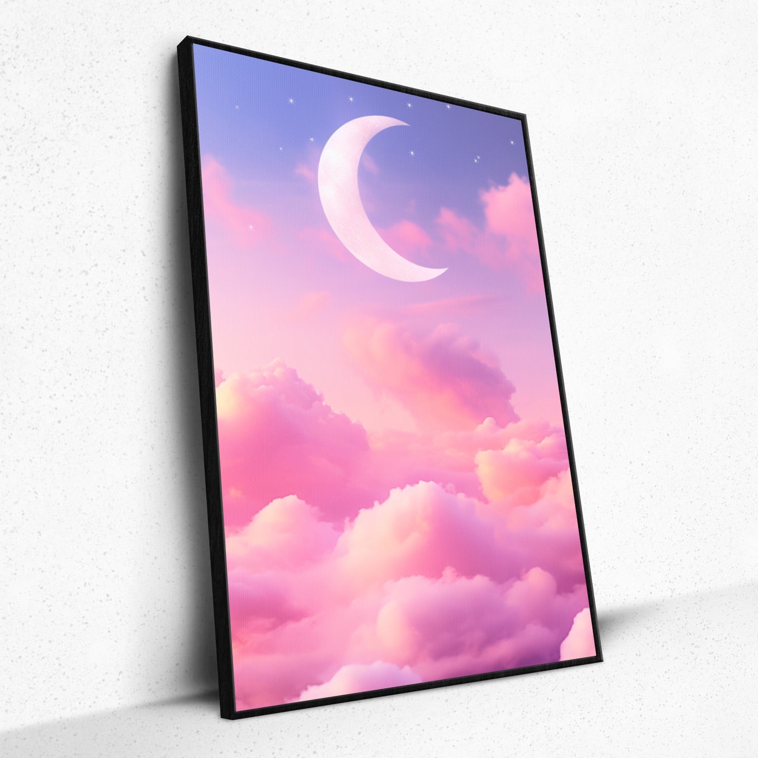 • Dive into the serene embrace of "Lunar Blush" by Rivera Realms. Gentle pink clouds cradle a delicate crescent moon, creating an ethereal dreamscape that invites tranquility and wonder. This piece isn't merely art; it's a whispered lullaby for the soul. Let it grace your space, offering a daily dose of calm and celestial beauty with every glance.