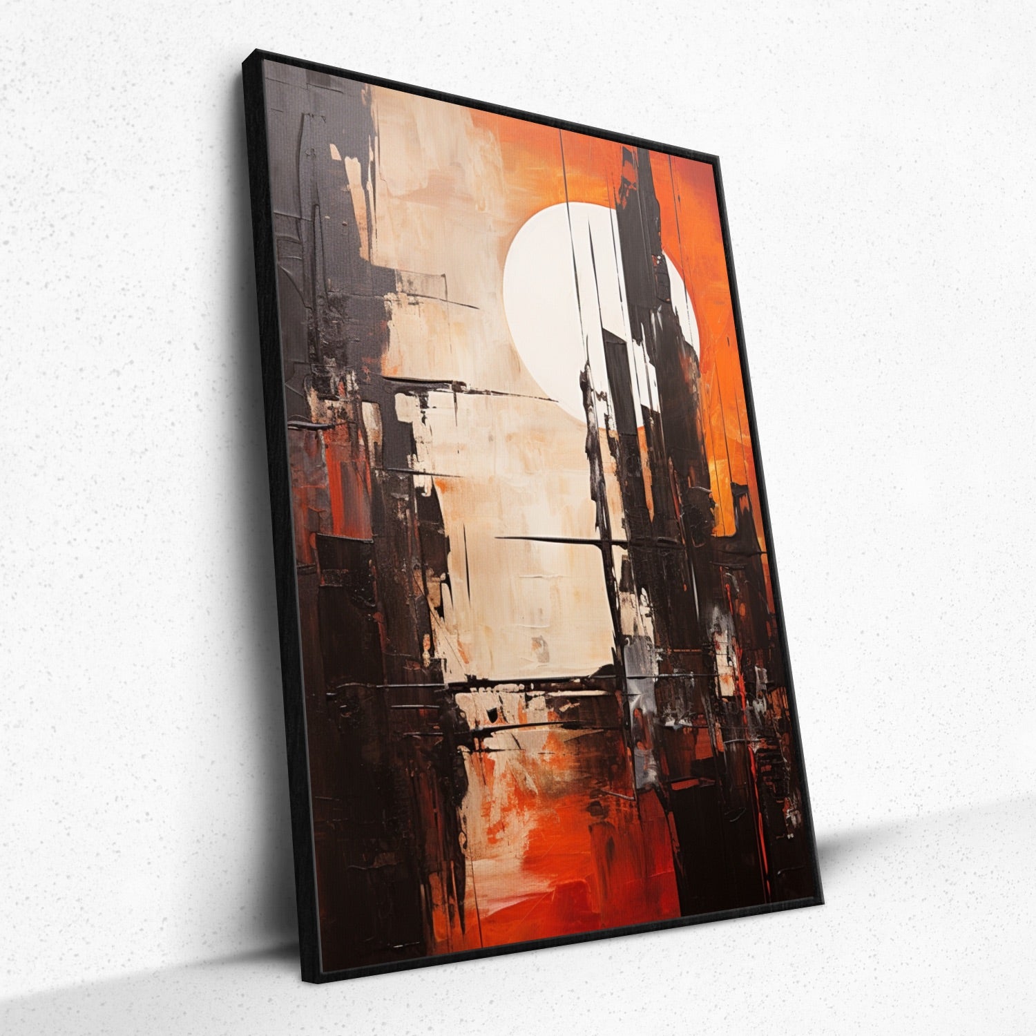 • Dive into the vibrancy of "Metropolis Mirage" by Rivera Realms. This cityscape, rendered in bold strokes of orange, white, and black, captures the essence of urban life – both its chaos and beauty. The abstract approach lends an air of mystery, inviting viewers to explore and interpret their own tales of the city. Minimalist yet evocative, this piece becomes a striking centerpiece, turning any space into an urban sanctuary. Experience the city's pulse in every brushstroke.