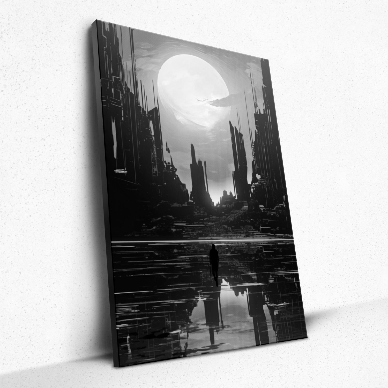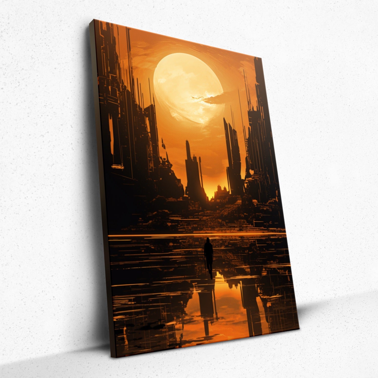 • Introducing "Solitude in Heights" from Rivera Realms - a hauntingly beautiful testament to urban isolation. Amidst looming skyscrapers, a lone figure treads, enveloped in the bold embrace of an orange, almost otherworldly glow. It's more than just a scene; it's an emotion, a quiet commentary on the vastness of our world and the solitude one can feel even in its crowded corners. Let your walls tell a tale of introspection and profound depth with this evocative masterpiece.