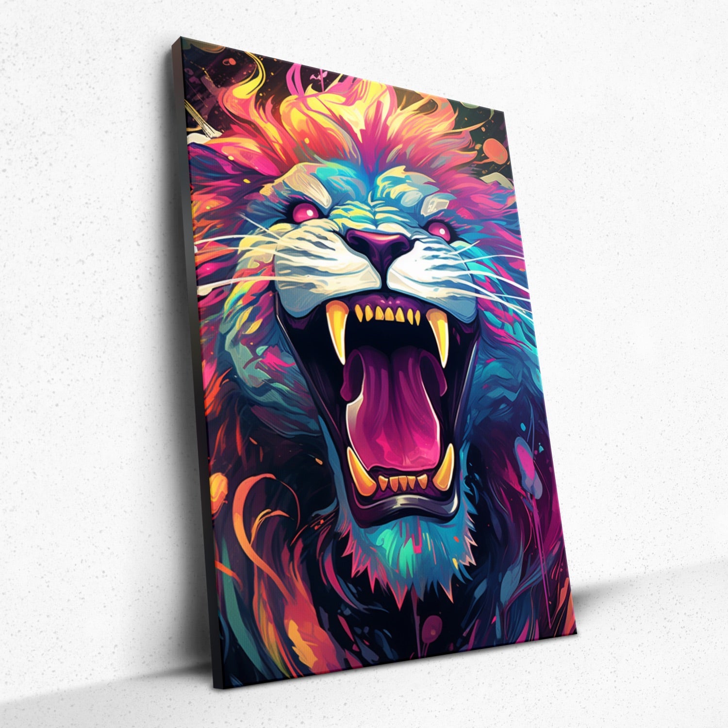 • Experience the 'Spectral Savanna Serenade', where untamed majesty meets a kaleidoscope of emotion. Rivera Realms, in its signature style, has blended the ferocity of the lion with an arresting palette of blue, pink, and orange. The roar isn't heard; it's felt, echoing in colors that pulse with fervor and fantasy. Let your space resonate with passion and artistry, with a piece that sings of wild dreams and infinite horizons.