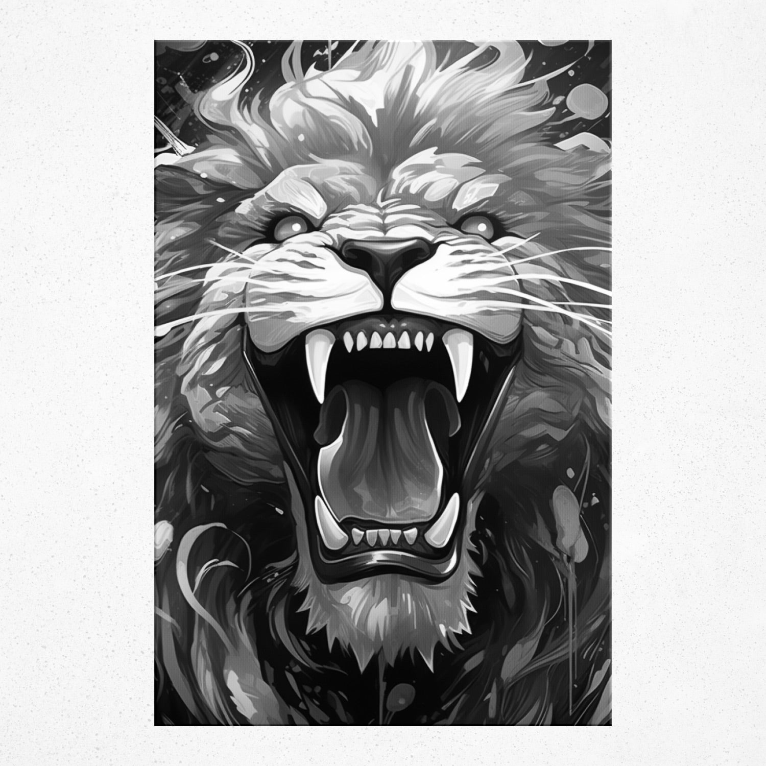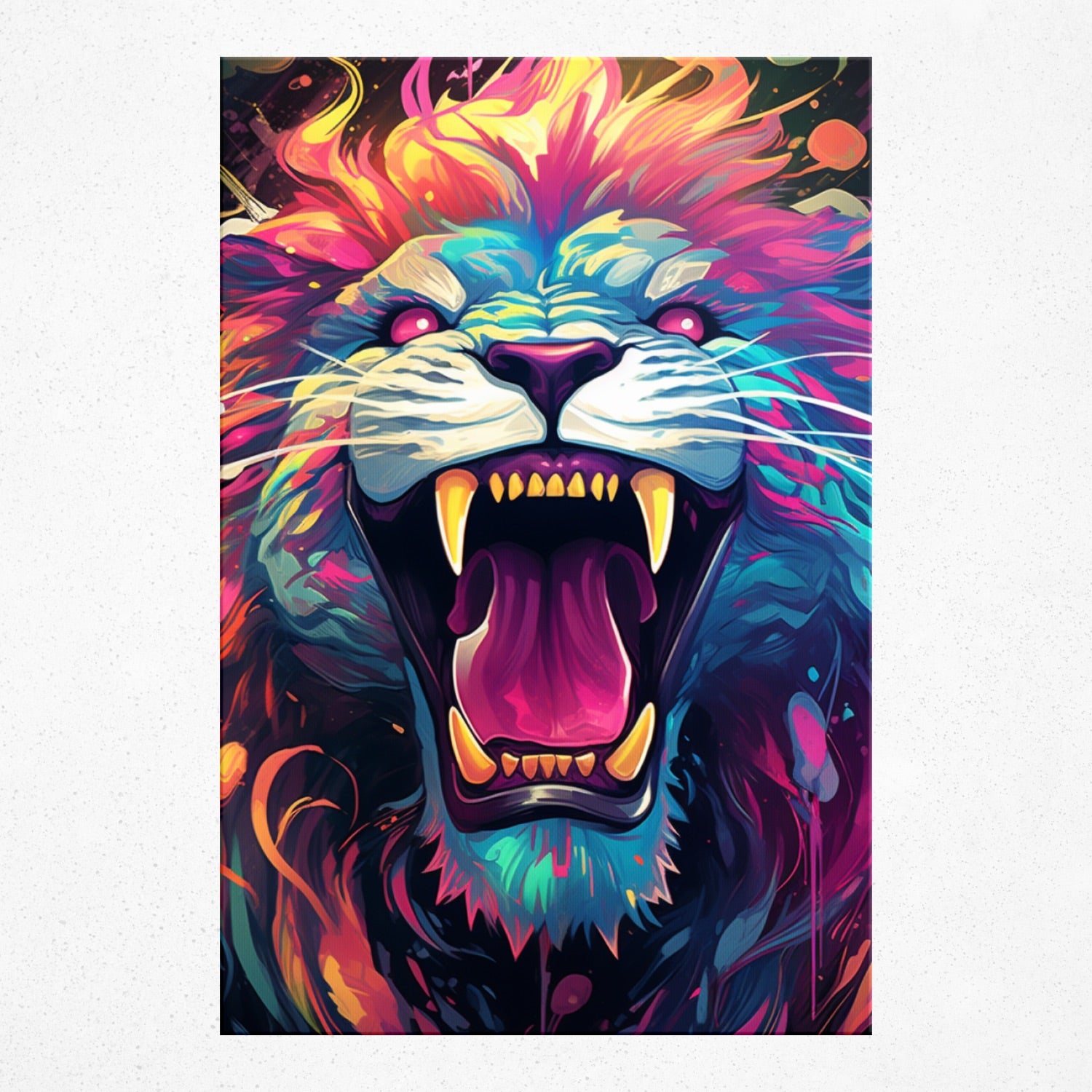 • Experience the 'Spectral Savanna Serenade', where untamed majesty meets a kaleidoscope of emotion. Rivera Realms, in its signature style, has blended the ferocity of the lion with an arresting palette of blue, pink, and orange. The roar isn't heard; it's felt, echoing in colors that pulse with fervor and fantasy. Let your space resonate with passion and artistry, with a piece that sings of wild dreams and infinite horizons.