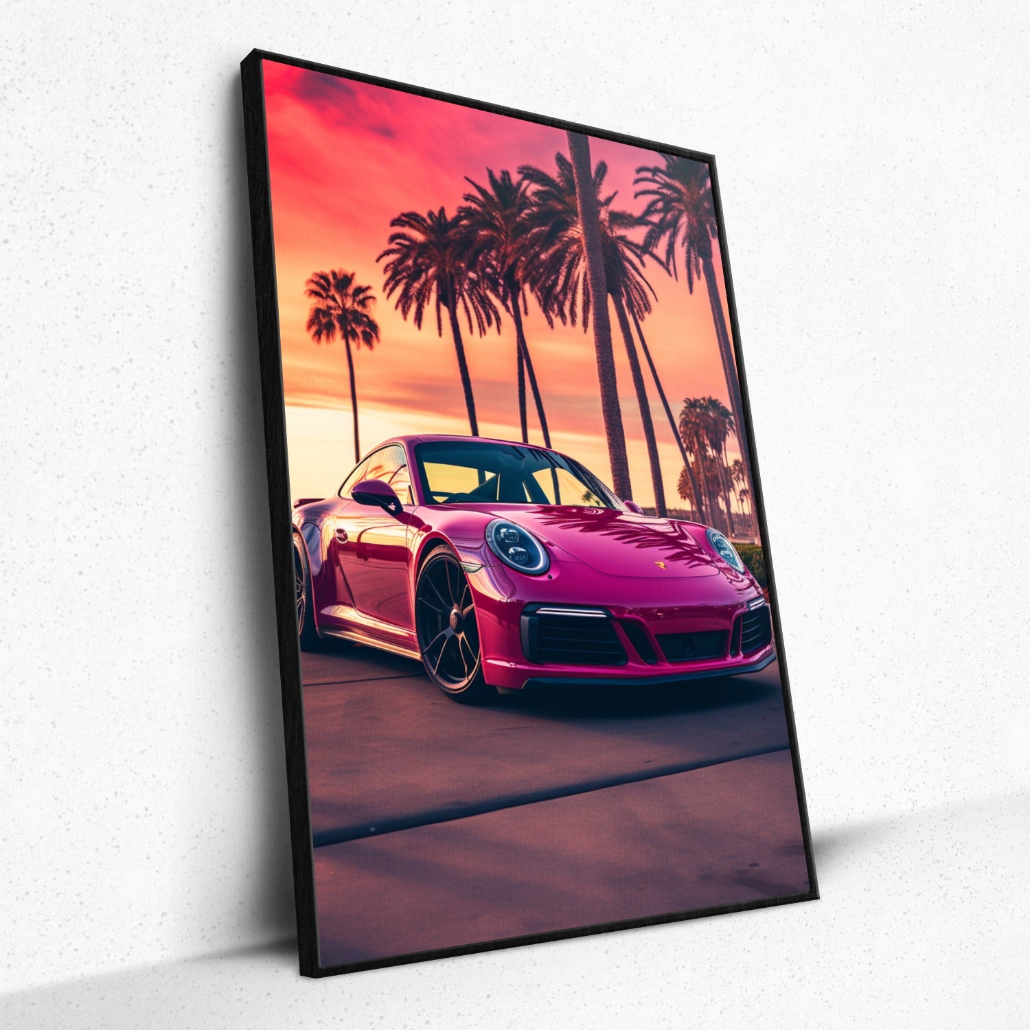• Unveiling "The Pink Pursuit" from Rivera Realms, where luxury meets nature's allure. The sleek pink Porsche 911 stands as an emblem of sophistication, juxtaposed against the radiant glow of a tropical boulevard at dusk. Every brushstroke invites you into an opulent journey, where dreams ride into the horizon. A fusion of power and paradise, this piece captures the essence of vibrant living, making every room a lavish retreat.